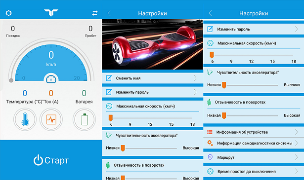 - Подключение к смартфону – мобильное приложение TaoTao, разработанное производителем материнских плат и контроллеров, позволяет осуществлять тонкую настройку гироскутера с помощью смартфона (доступно в AppStore и PlayMarket). Пользователь сможет менять чувствительность датчиков, ограничивать максимальную скорость, контролировать заряд батареи и т.д. (подробнее, см. ниже)